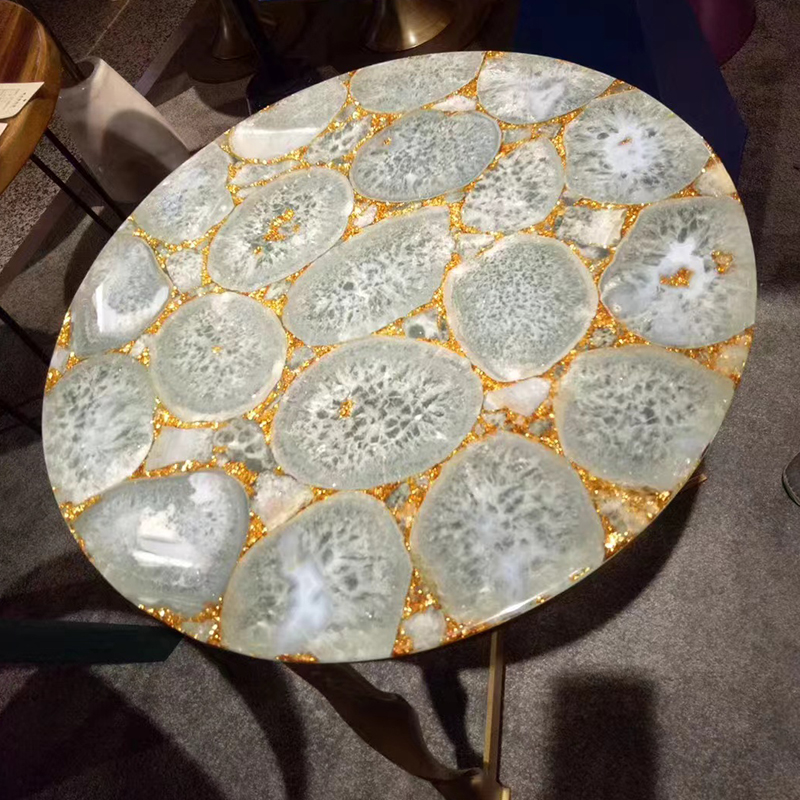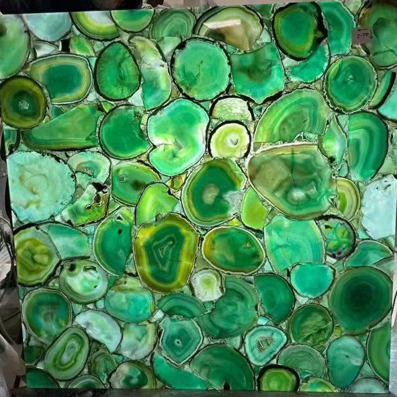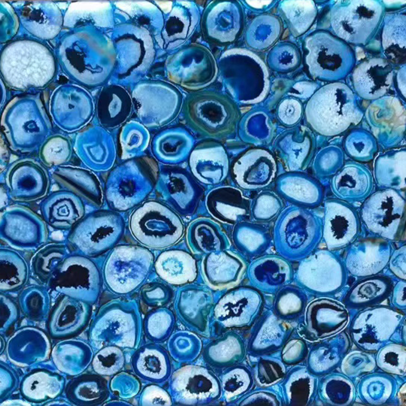 Semi-precious stone slabs (most commonly agate, crystal, and quartz) are engineered by cutting and bonding natural stone flakes into large-format panels. They stand out from ordinary marble or quartz with: